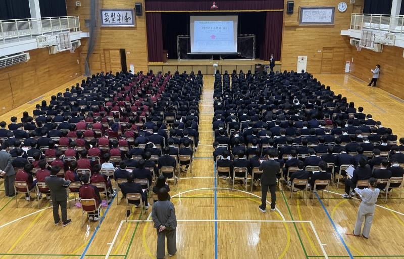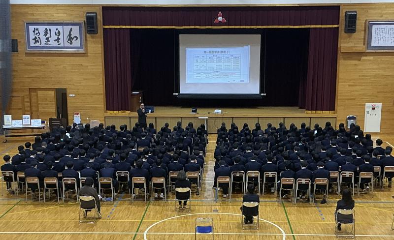 生徒会が中心となり、情報活用能力の必要性や情報モラルに関する意識を高めるために、1学年は第一体育館、2学年は第二体育館、3学年は各教室において情報モラル教室が実施されました。