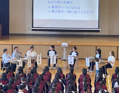 学校運営協議委員3名と学年代表生徒3名、ファシリテーターにホーン沙耶佳氏をお招きし、「私にとっての青森」をテーマに、1学年生徒が青森の魅力や課題について考えを深めました。それぞれの立場で青森の課題や魅力を浮き彫りし、生徒自身が「青森の未来」を意識することを目標として議論を行いました。