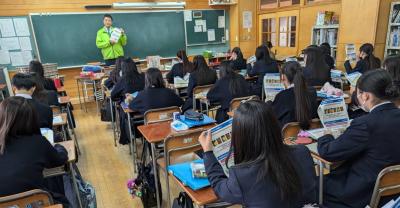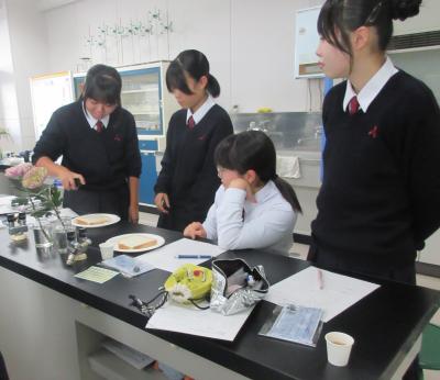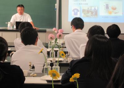 あおもり藍産業株式会社より、営業開発部長の高橋氏と取締役工場長の佐々木氏をお招きし、青森の藍産業の中でも特に「あおもり藍」の抗菌効果について講演を受けました。講演後には、抗菌効果に関する実験も行い、参加生徒は藍の持つ機能性について理解を深めました。