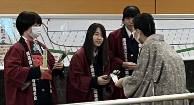 ホテル青森で行われた成果発表会で、代表生徒が発表を行いました。発表テーマは「津軽塗キティを世界へ」です。これまでの探究の成果を堂々と発表することができました。各校から「発想が斬新で面白かった」「問題点や魅力がしっかり整理されていて、その上で現実的な解決策が示されていて良かった」「ぜひ実現してほしい!」などのコメントをいただきました。発表の様子は「■活動風景(動画)★「あおもり創造学」成果発表会編」から見ることができます。